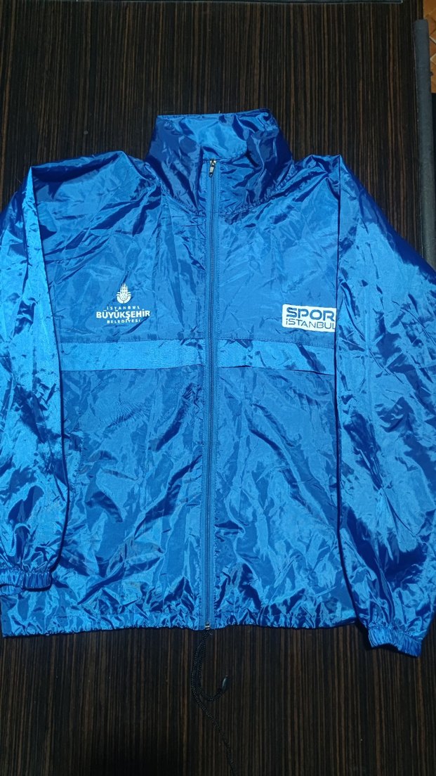 İstanbul belediye spor logolu kapşonu gizlenebilen yağmurluk çok az kullanılmış sorunsuz yeni gibidir yırtık sökük deforme renk solması yok, S beden / Mavi Renk / Unisex / Astarsız / yıkanıp temizlenmiştir