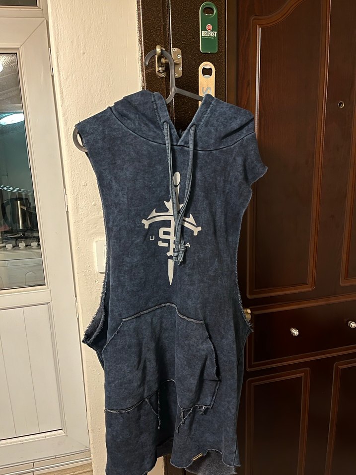 Erkekler için lacivert batik desenli denimden yapılmış, kapüşonlu yan detaylı, kolsuz ve bol kesim sporcu atleti.