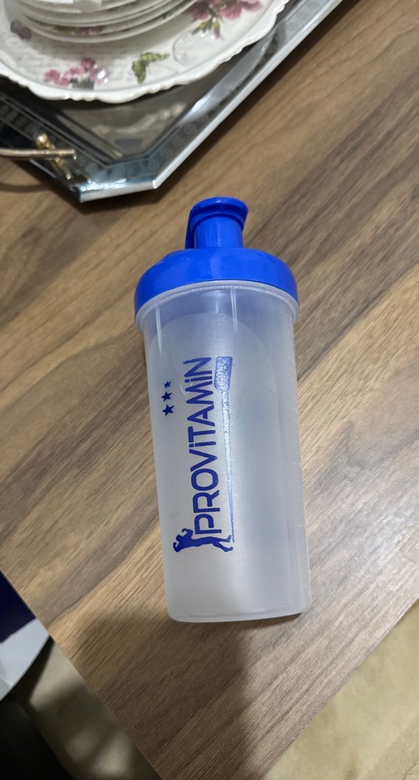 Renkli mavi kapaklı, Provitamin yazılı şeffaf gövdeli sporcu kabı. Kullanımı kolay pratik tasarım.