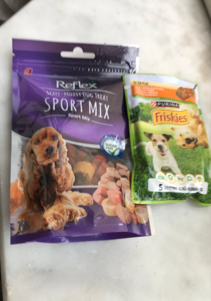 Sport Mix ve Friskies köpek ödül mamaları, küçük ve orta boy köpekler için çeşitli lezzetlerde, kilitli poşetlerde sunulur.