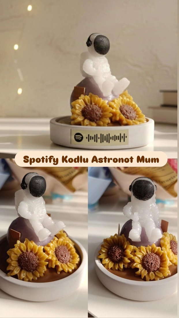 Kahverengi taban üzerinde ayçiçeği detaylı, koyu renk astronot figürlü mumdur. Spotify kodu içerir. ️