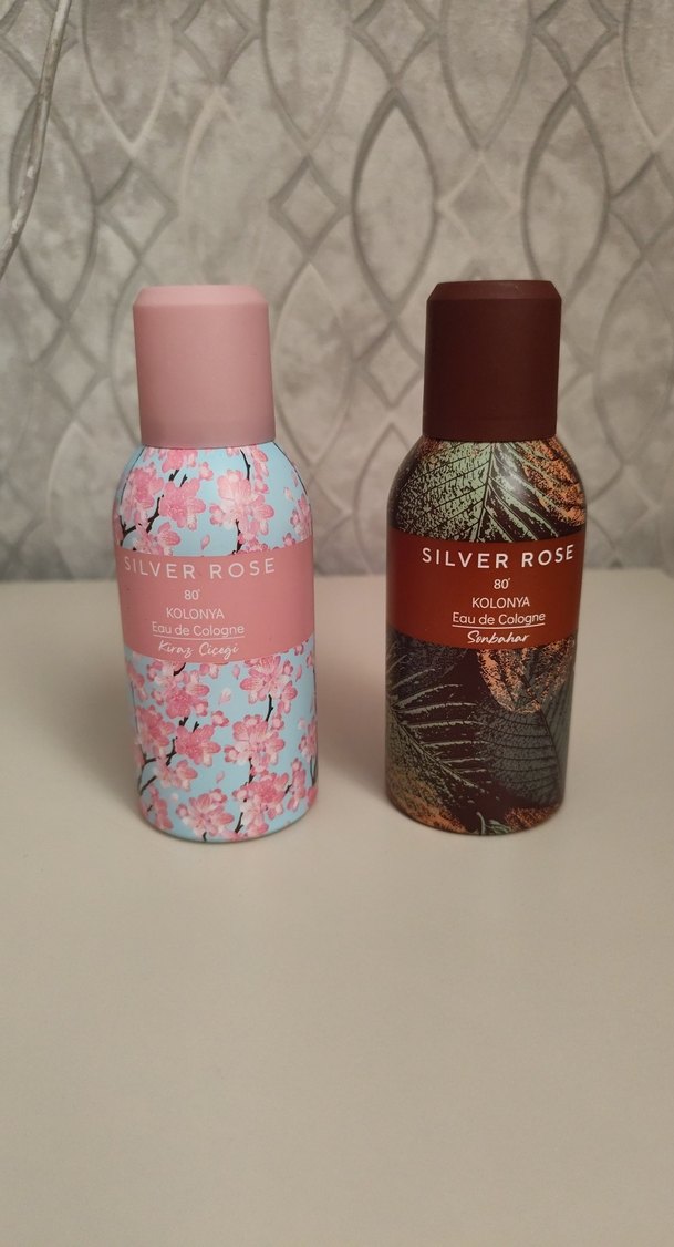 Silver Rose kadın kolonyası 80 ml, çiçeksi ve sıcak koku seçenekleriyle. Her şişe kokusunu yansıtan farklı tasarıma sahip. Biri sonbahar odusu koku diğeri kiraz çiçeği. sonbahar hiç kullanılmadı kiraz çiçekli olan bir kez denendi