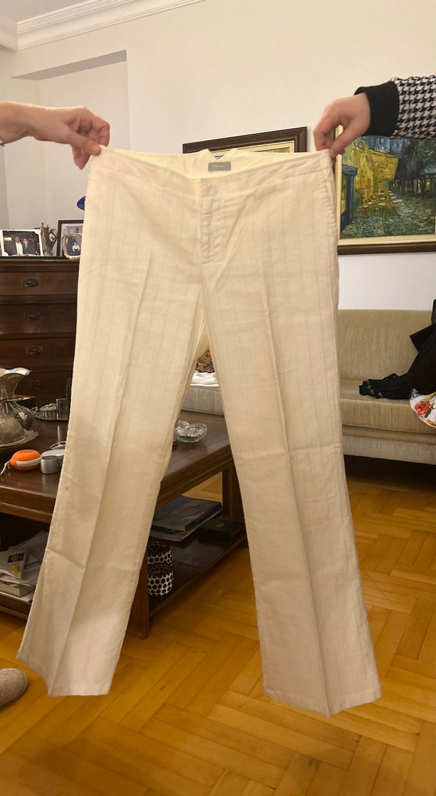 Bej renkli keten kumaştan, pilili, normal boy midi uzunlukta kadın pantolon. Ofis ve iş ortamına uygun, rahat kesimli, desensiz tasarım.