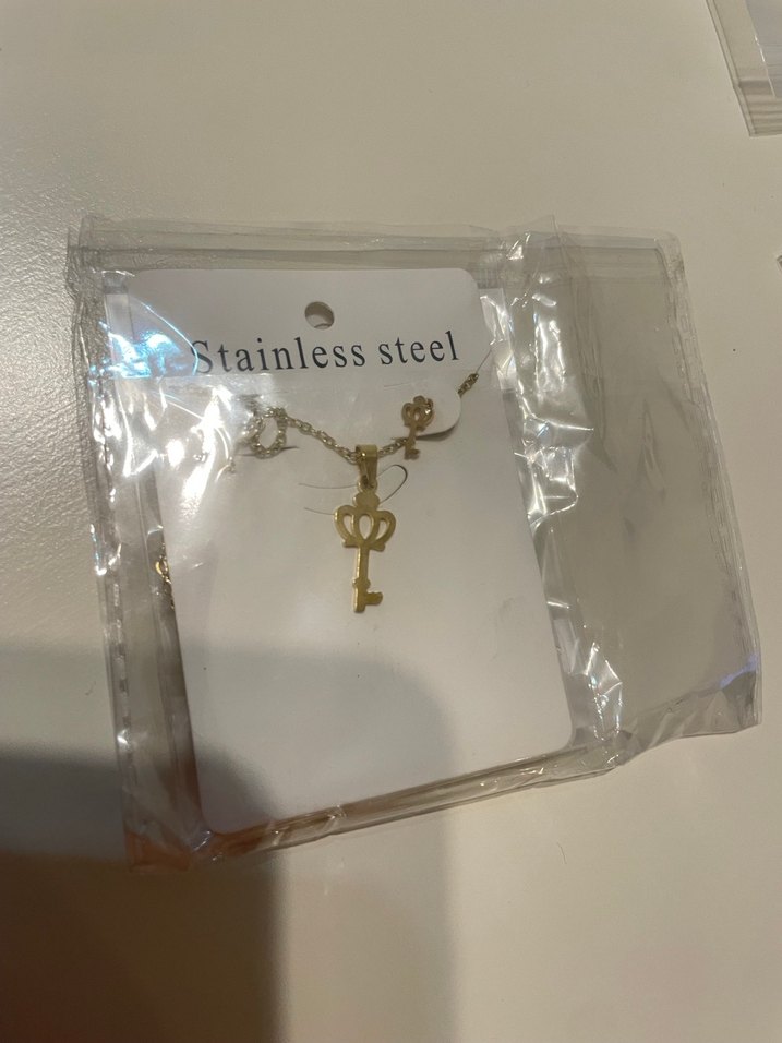 Paslanmaz çelikten yapılmış, zincir detaylı, midi uzunlukta altın renkli kolye küpe. Parlak yüzeye sahip anahtar şeklinde bir kolye ucu bulunur, günlük kullanım için uygundur.