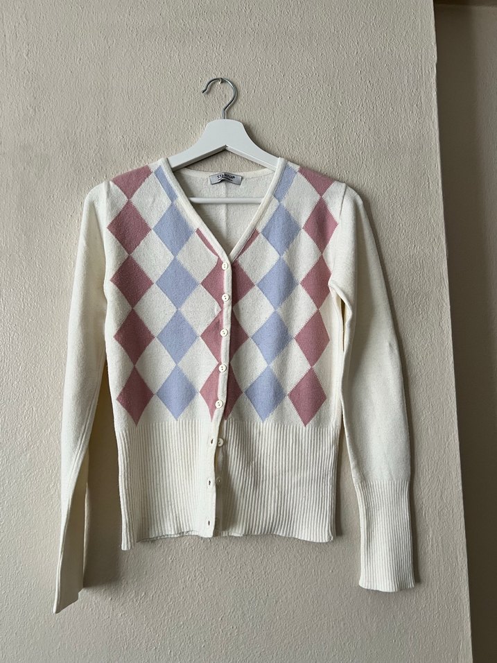 Stamina triko hırka, V yaka ve pastel renkli baklava deseni ile. Uzun kollu, bol kesim ve günlük kullanıma uygun.Sadece iki kez kullanıldı.Tertemizdir.