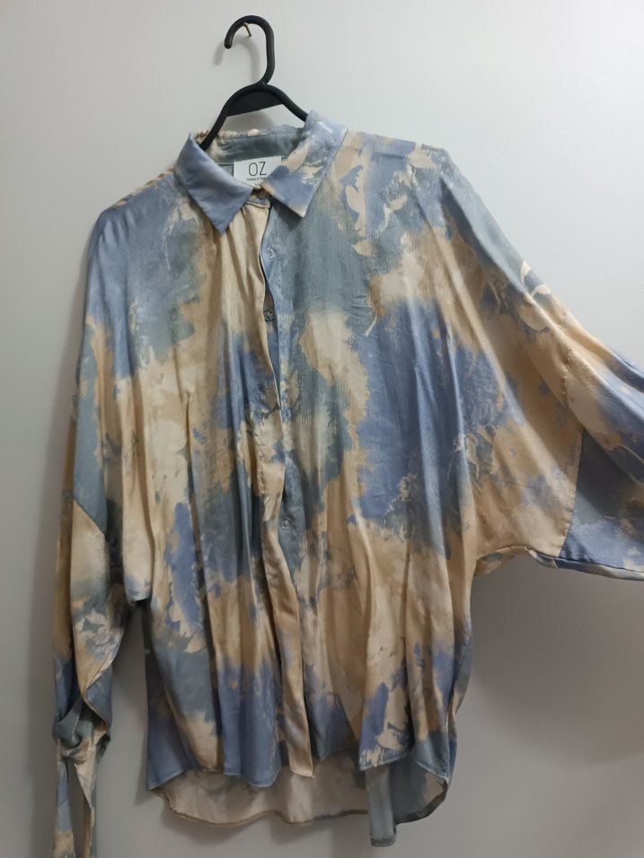 mavi ve bej tonlarında batik desenli, düğmeli, yakalı, bol kesim uzun , yarasa kollu kadın gömleği, yumuşak kumaştan yapılmıştır. standart beden