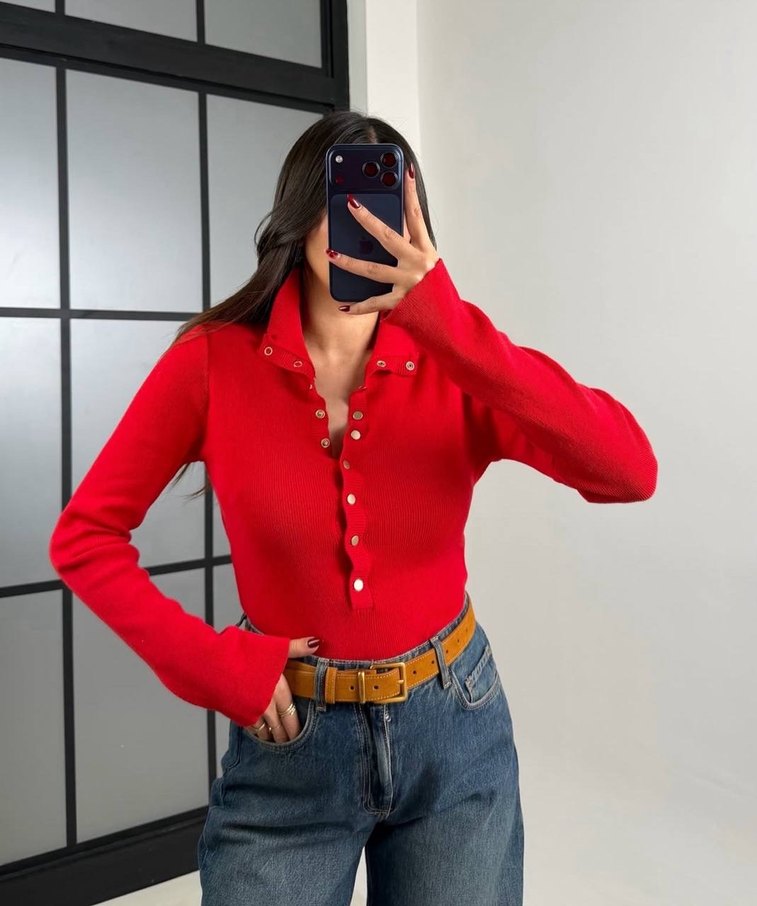 Dar kesim, uzun kollu ve yakalı düğmeli kırmızı kadın triko. Normal midi boyda, denim kumaştan, günlük sokak stili için uygundur.