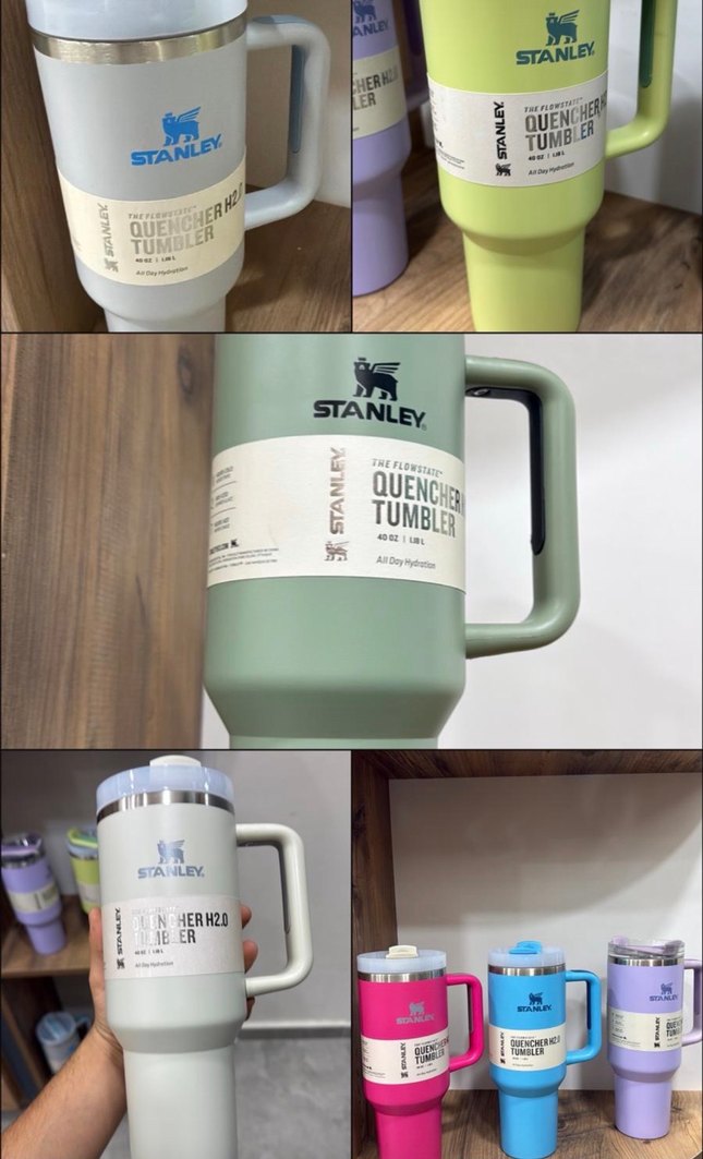 Stanley Quencher Tumbler bardaklar, büyük kulp ve gri, haki, pembe, mavi, mor gibi canlı renklerde sunulur. Kolay taşınabilir ve kullanışlıdır.