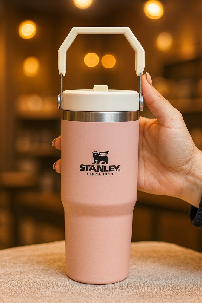 Pembe renkte Stanley termosu, sağlam kulplu ve içecekleri sıcak tutar. Üzerinde 'STANLEY., SINCE1913' yazısı bulunur.