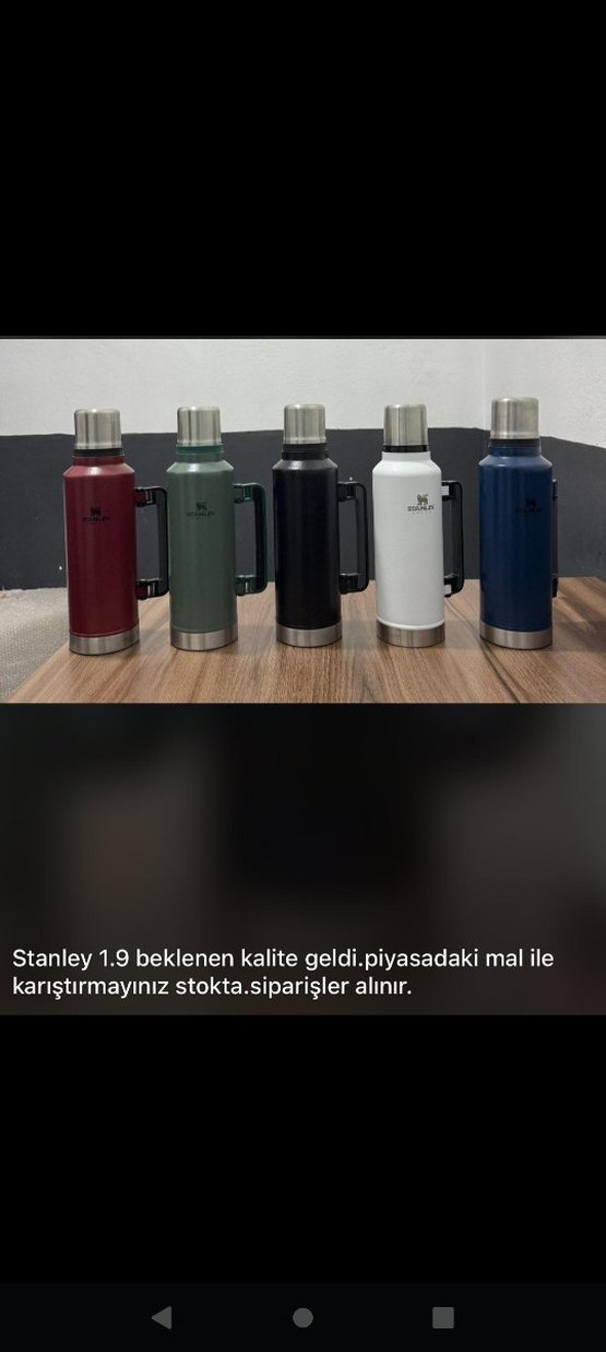 Stanley 1.9 litre termos şişeler, koyu renk seçenekleriyle. Dayanıklı ve kaliteli, içecekleri sıcak veya soğuk tutar. Sipariş alınır.