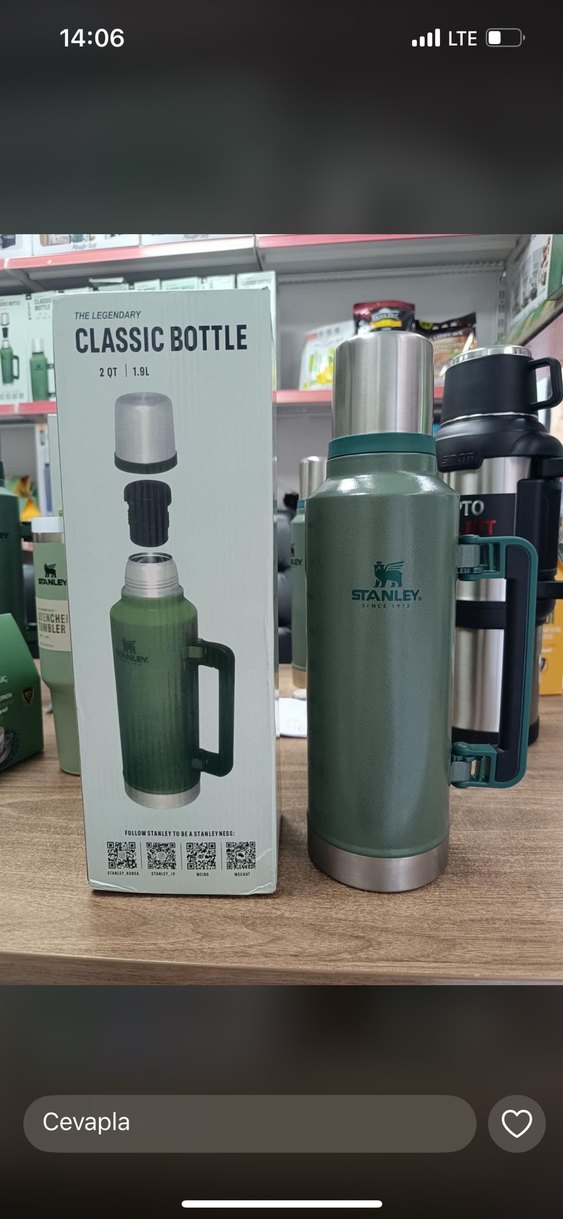Stanley Classic Bottle 2 litre hacminde, taşıma kolaylığı sağlayan sağlam saplı haki renk termos şişedir. İçecekleri sıcak veya soğuk tutar.