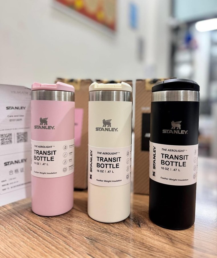 Stanley Transit Bottle, 470 ml kapasite ve hafif yalıtım sunar. Bej renkte, güvenli kapaklı sıcak veya soğuk içecekler için uygundur.