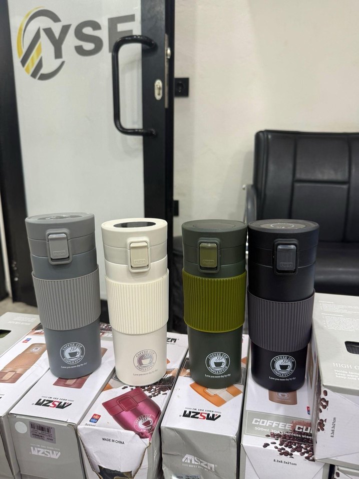 YSE gri renkli termos, güvenli açılır kapak ve kolay tutuş için kabartmalı sap içerir. İçecekleri sıcak tutar, çocuklar için uygundur.
