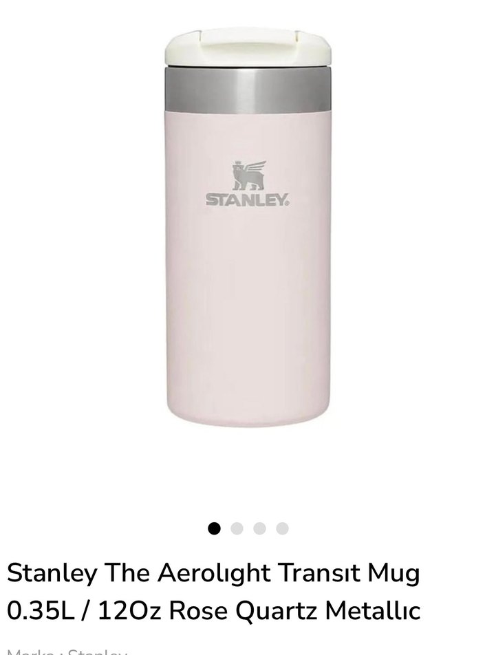 Stanley Aerolight Transit Mug, 0.35L kapasiteye sahip, pastel pembe ve metalik görünümlü. Hediye geldi, çok kullanmadım.