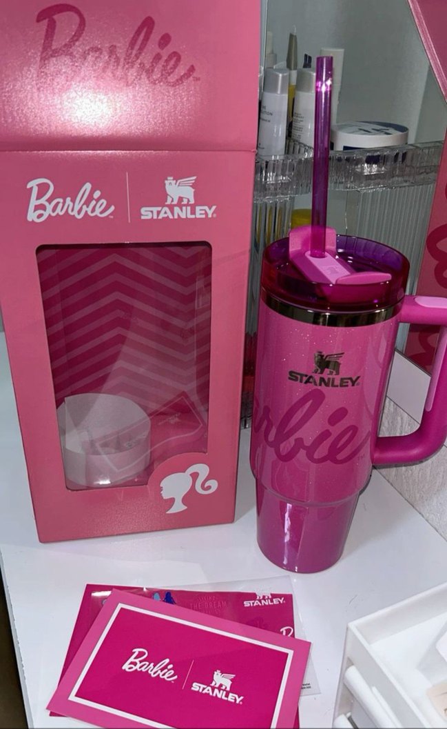 Stanley Barbie logosu ve renkli tasarımıyla pembe termos bardak, sap ve pipet içerir. İçecekleri sıcak veya soğuk tutar.