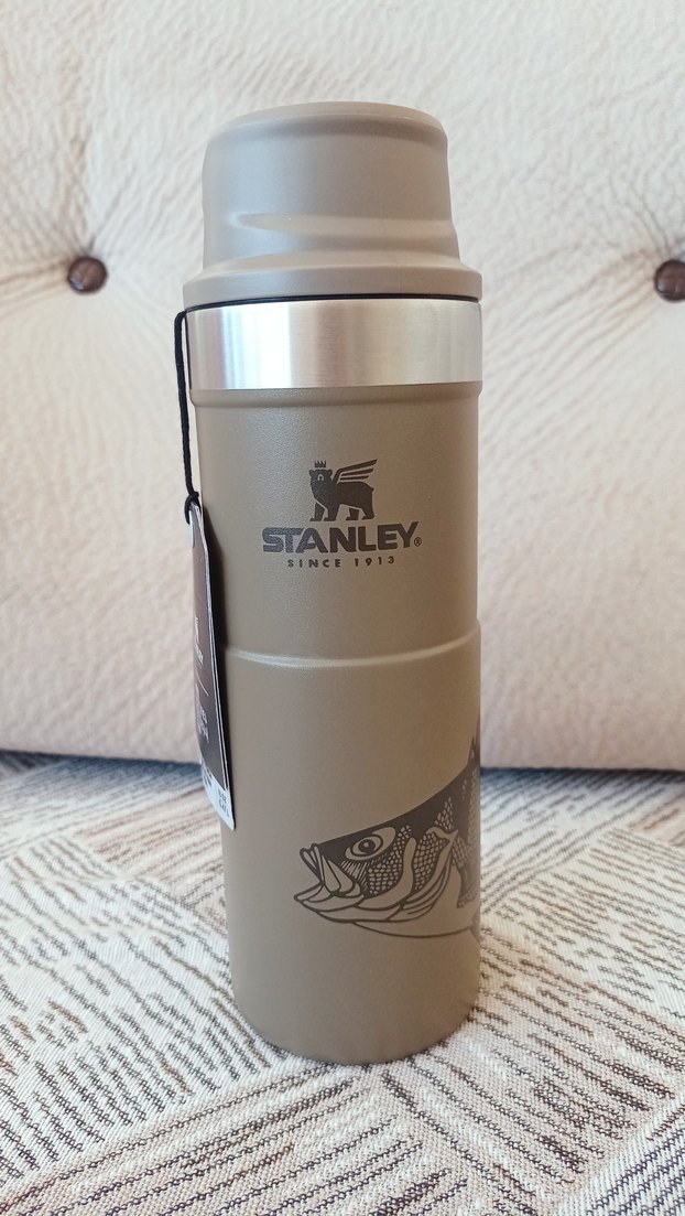 Stanley markalı bej ve gri renklerde, balık desenli dayanıklı termos şişe. Sıcak tutan kapak ve taşıma ipi bulunur.
