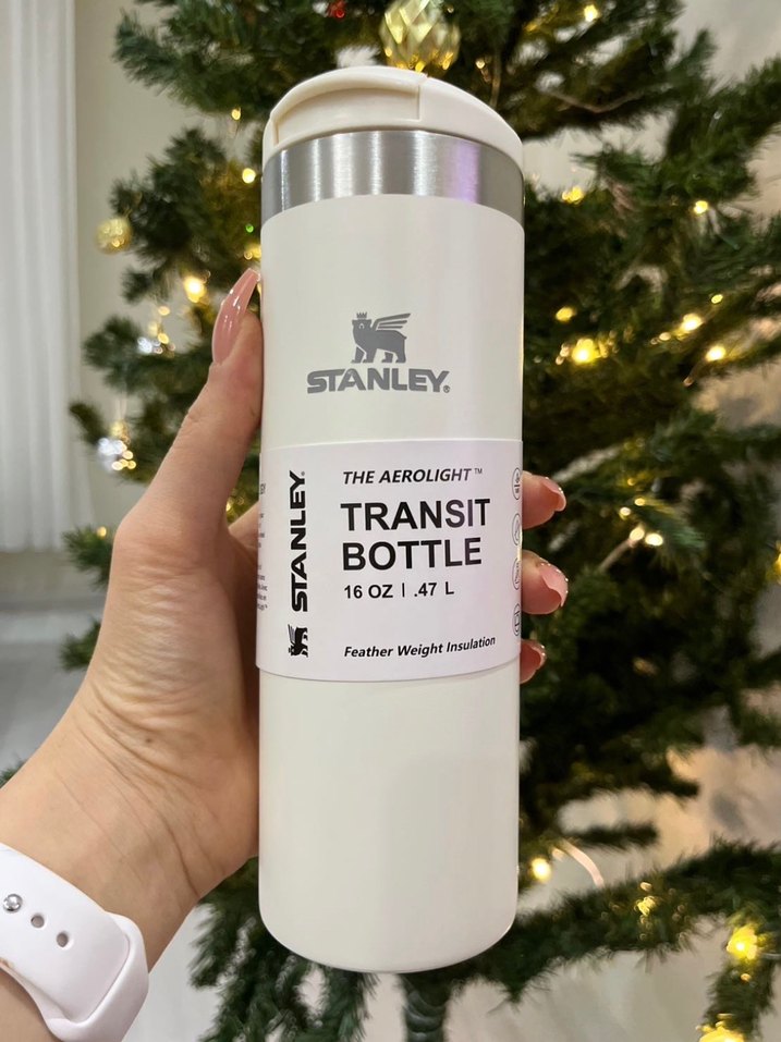 Stanley beyaz termos şişe, 470 ml kapasite, hafif izolasyon ve güvenli kapak ile sıcak veya soğuk içecekler için uygundur.