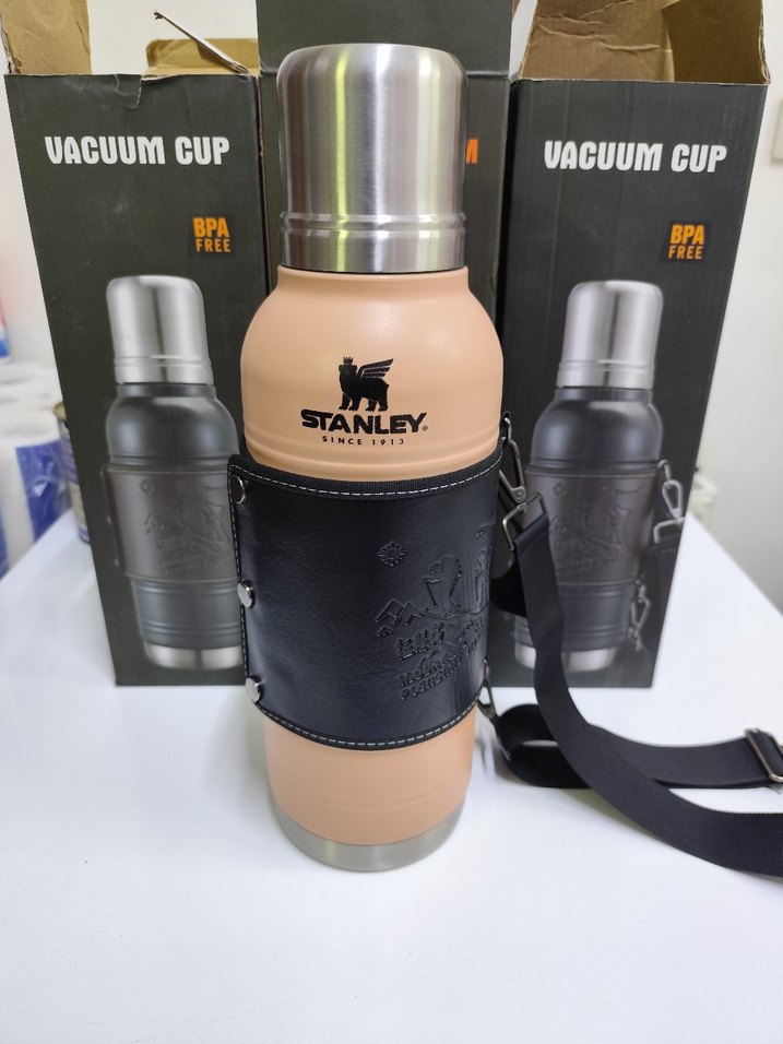 1.9 litre Stanley markalı vakumlu termos şişe, siyah deri kayışlıdır. BPA içermez, içecekleri sıcak veya soğuk tutar.