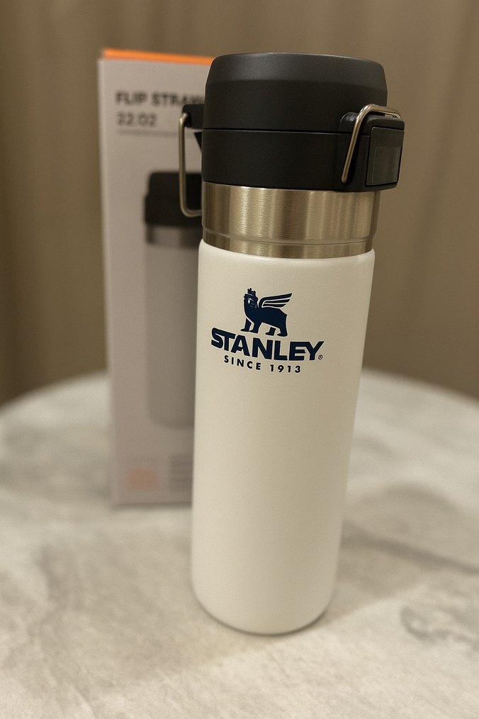 Stanley beyaz çelik termos matara, güvenli flip pipet kapağı ile içecekleri sıcak ya da soğuk tutar. Dayanıklı ve kullanışlıdır.