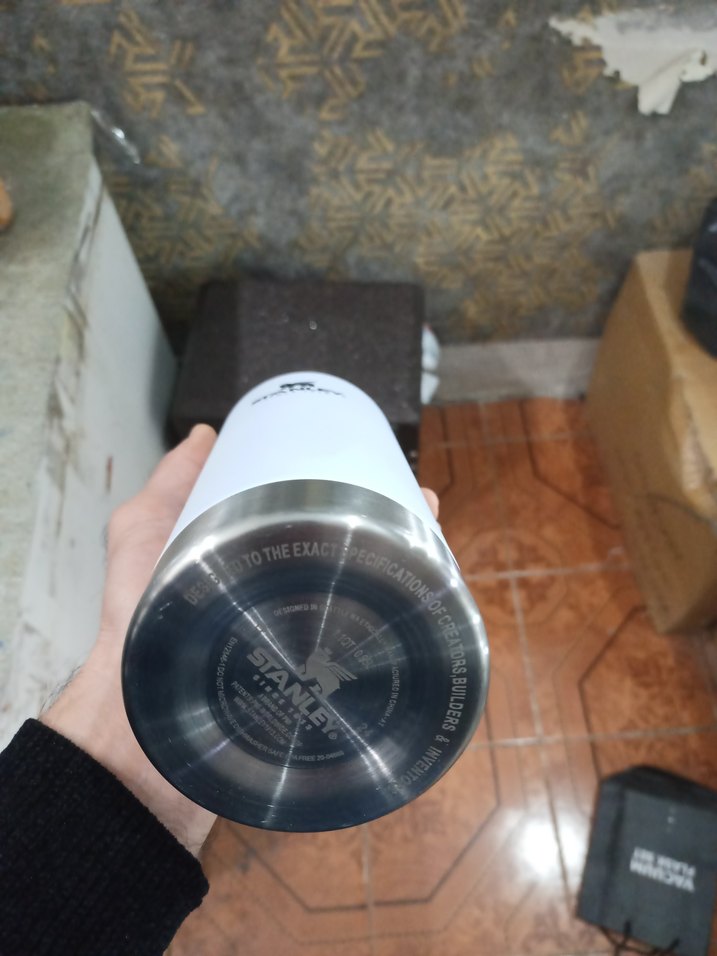 Stanley marka beyaz ve gri renkli termos şişe, dayanıklı paslanmaz çelikten yapılmıştır. İçecekleri uzun süre sıcak veya soğuk tutar. Üzerinde OTHEEXA yazısı bulunur.