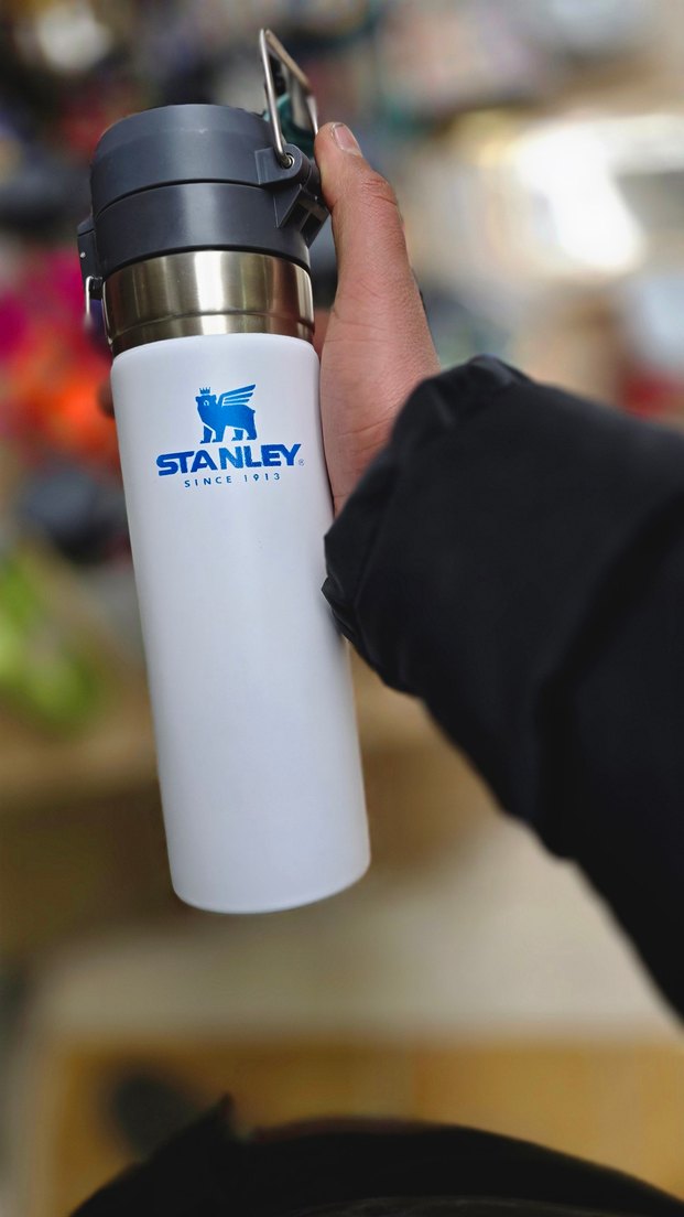 Stanley beyaz çocuk termos şişesi, dayanıklı yapısı ve güvenli kapağı ile içecekleri sıcak veya soğuk tutar. Renkli logo ve taşımaya uygun tasarımı bulunur.