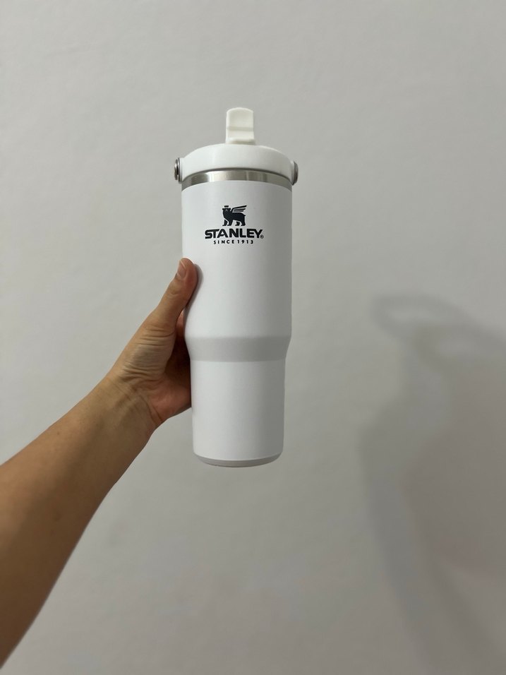 Beyaz Stanley çocuk termos şişesi, içecekleri sıcak veya soğuk tutar. Güvenli kapak ve dayanıklı yapıya sahiptir.