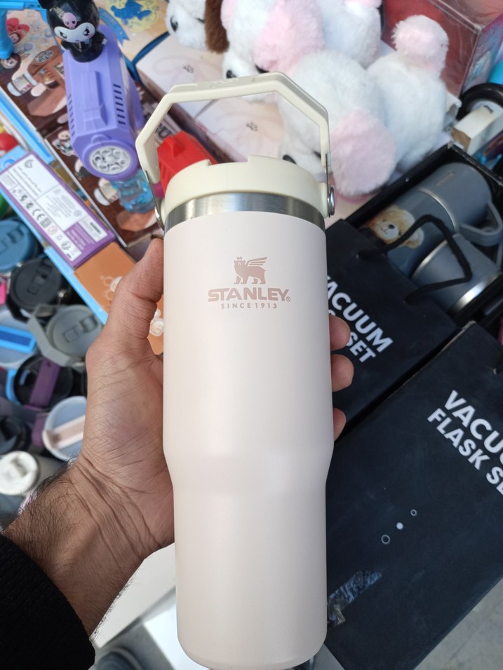 Stanley markalı beyaz termos şişe, hafif renkte ve taşıma kolaylığı sağlayan sağlam kulpa sahiptir. İçecekleri uzun süre sıcak veya soğuk tutar.