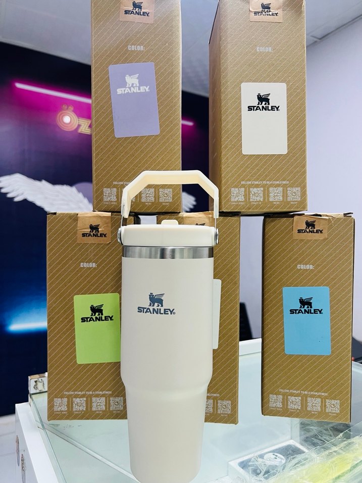 Stanley beyaz termos şişe, taşınabilir sağlam sapı ve içecekleri sıcak tutan izolasyonu ile dikkat çeker. Hafif renk ve logo detaylıdır.