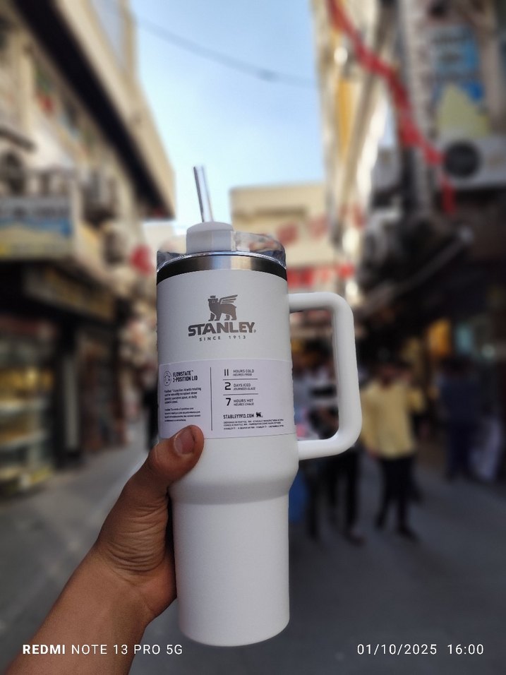 Stanley markalı beyaz çocuk termos şişesi, saplı ve pipetlidir. İçecekleri uzun süre sıcak veya soğuk tutar. Hafif ve çocuk dostudur.