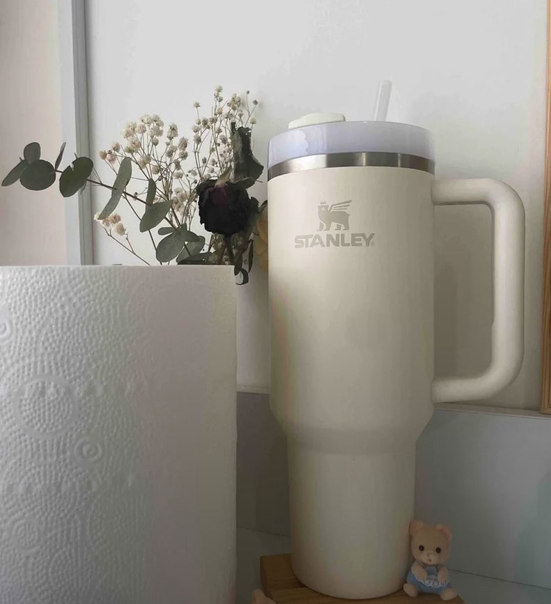 Stanley markalı beyaz ve gri detaylı kahve makinesi, kullanımı kolay sap ve kapak içerir. ☕ orjinal lisanslı Termos kapalı kutu instagram satışı ghoncashop.com