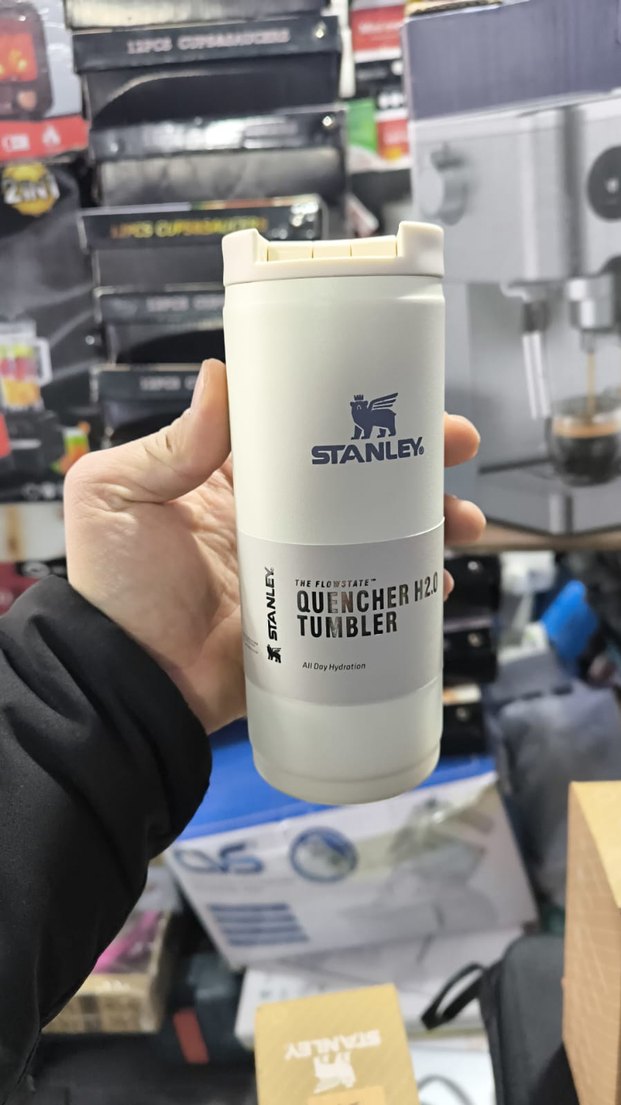 Stanley beyaz parlak termos matara, sağlam yapısı ve güvenli kapağı ile gün boyu su tutar. Çocuklar için uygundur. (ithal)