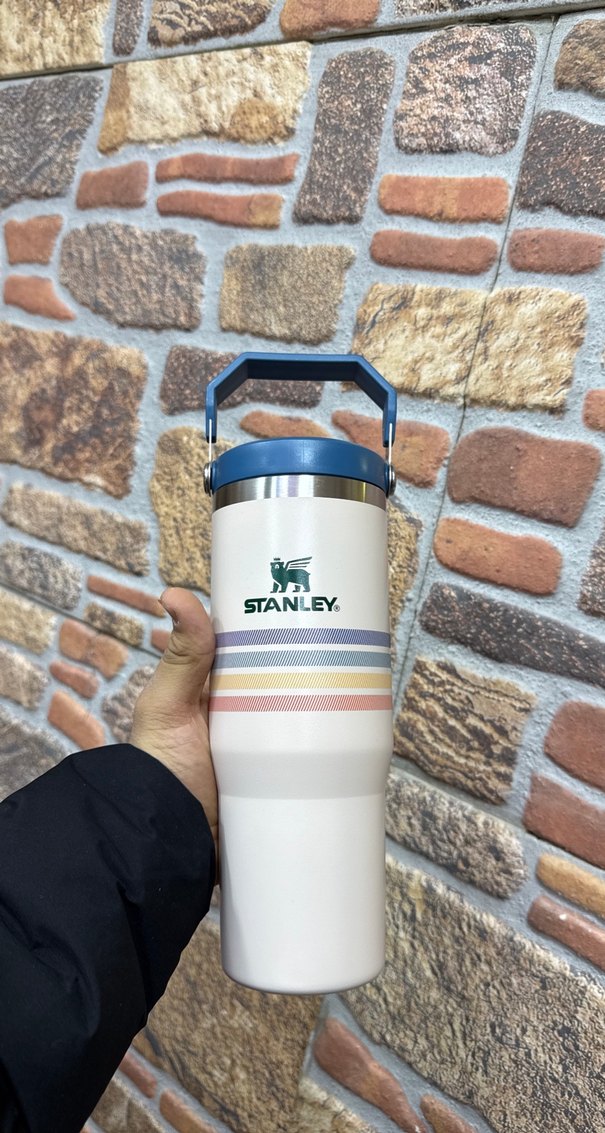 Stanley marka, sağlam saplı ve renkli çizgili beyaz çocuk termosu, içecekleri sıcak tutar.