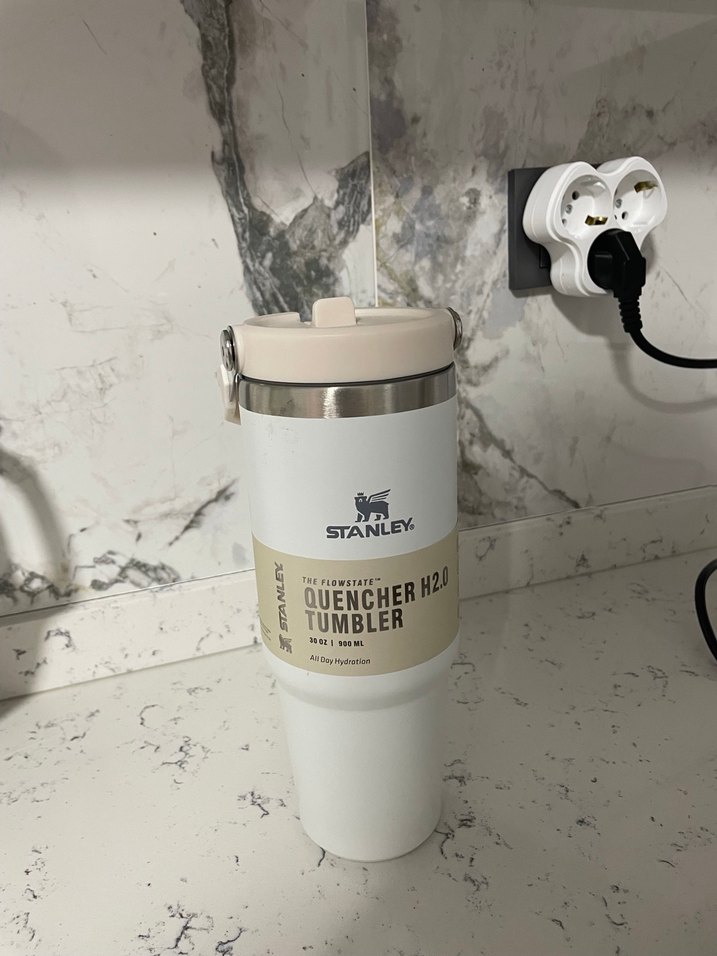 Stanley markalı, 900 ml kapasiteli beyaz termos matara. Güvenli kapak ve gri detaylara sahiptir. Orijinal ben de aynısı olduğu için satışta bu yüzden uyguna bırakacağım