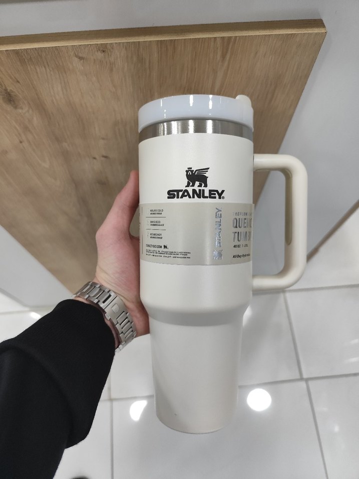 Stanley markalı beyaz termoslu kupa, kulplu ve kapaklıdır. İçeceklerinizi sıcak veya soğuk tutar, dayanıklı yapıya sahiptir. ☕