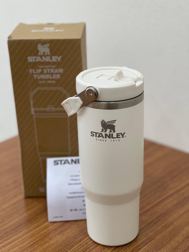 Stanley markalı beyaz çocuk termosu, flip pipet kapaklı ve dayanıklı yapısıyla içecekleri sıcak veya soğuk tutar.