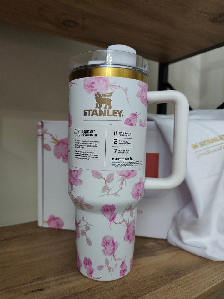 Stanley marka, pastel beyaz renkte, pembe çiçek desenli termos bardak. İçecekleri saatlerce sıcak veya soğuk tutar, taşıması kolay saplıdır.