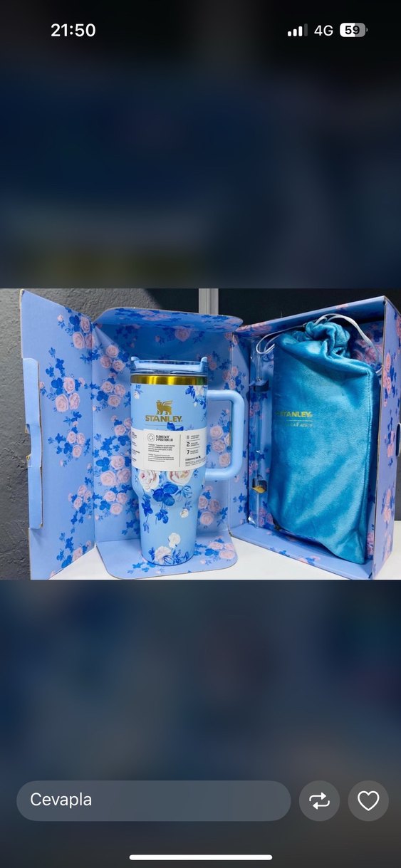 Stanley markalı, pastel mavi çiçek desenli termos bardak ve yumuşak mavi taşıma kesesi içerir. Çocuklar için içecekleri sıcak tutar.
