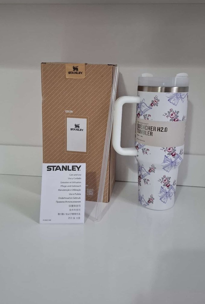 Stanley marka, çiçek desenli, hafif renkli termos matara. Kolay taşınması için sağlam saplı, içecekleri uzun süre sıcak veya soğuk tutar.