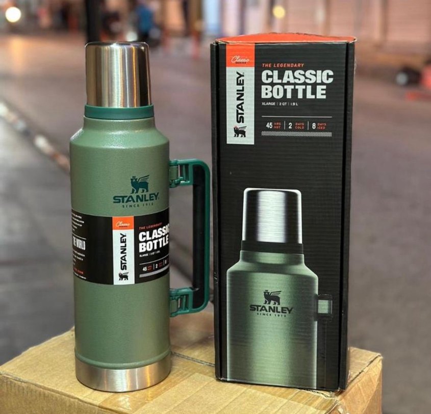 Stanley Classic şişe, dayanıklı tasarımı, sapı ve paslanmaz çelik kapağı ile uzun süre sıcak veya soğuk tutar.