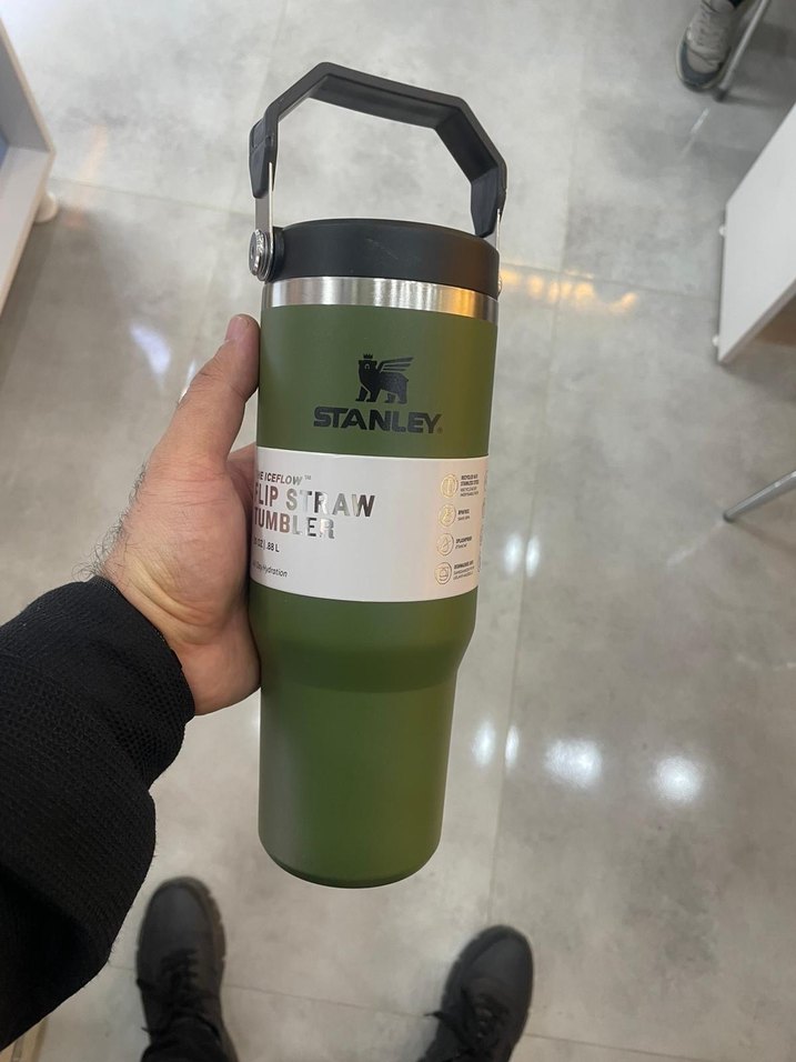Stanley çocuk termos matara, koyu haki renkte, sağlam saplı ve dökülmeyen pipetli tasarıma sahiptir. İçecekleri sıcak ya da soğuk tutar.