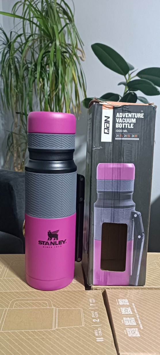 Stanley Adventure Vacuum Bottle, 1000 ml kapasiteye sahip, pembe ve gri renkte termos şişesidir. Sıvıları uzun süre sıcak veya soğuk tutar.
