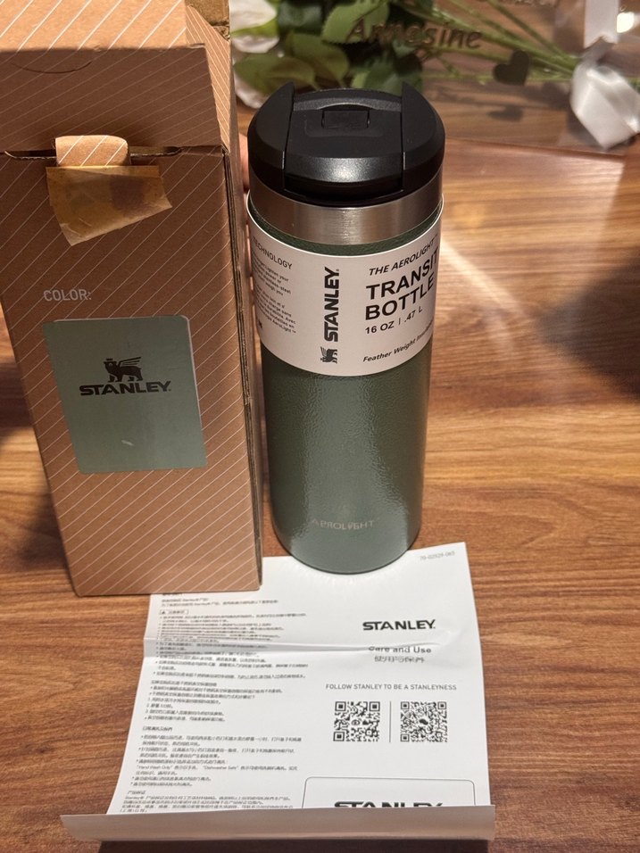 Stanley termos şişe, khaki renkte ve siyah kapaklıdır. 470 ml hacmindedir ve içecekleri sıcak veya soğuk tutar. Kutusu ve kullanım talimatlarıyla birlikte gelir.