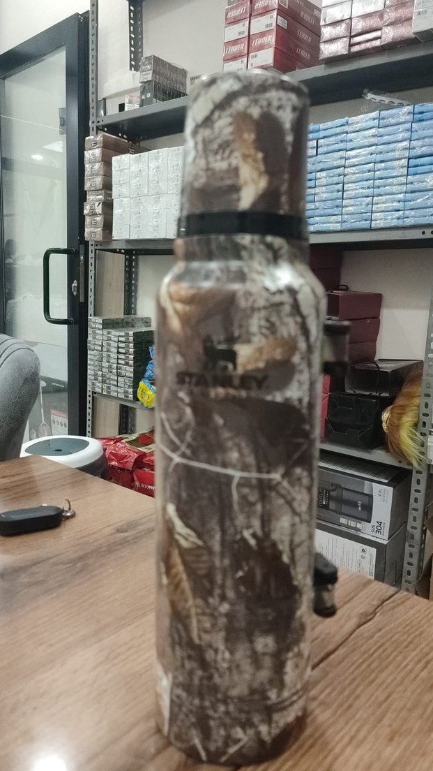 Stanley marka, koyu kahverengi kamuflaj desenli çocuk termos şişe, içecekleri sıcak veya soğuk tutar. Dayanıklı ve taşınabilir.