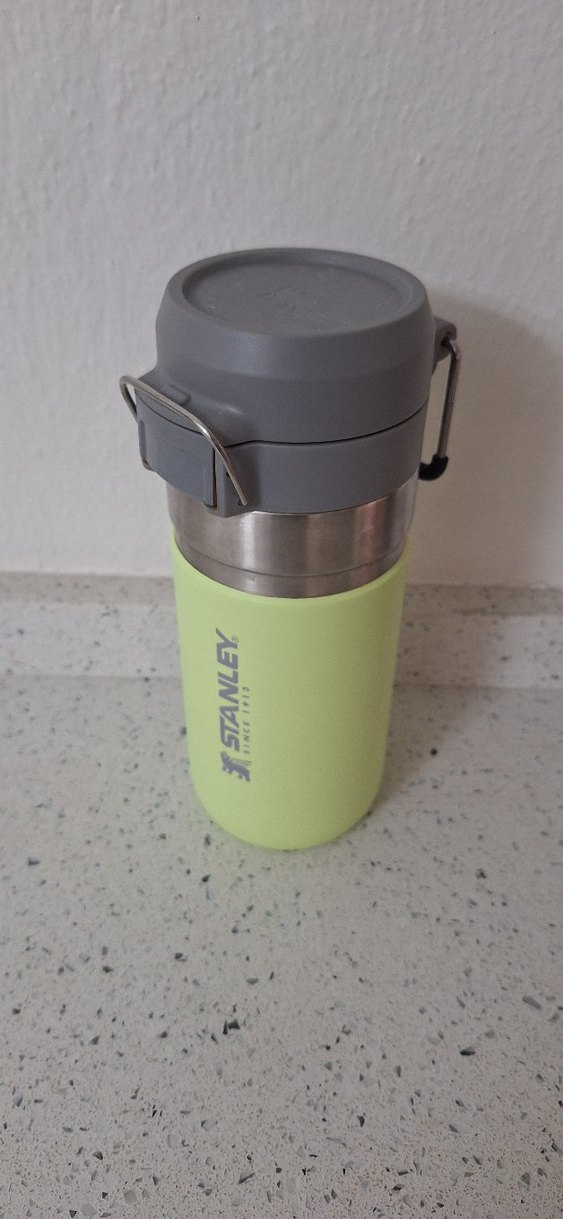 Stanley markalı çocuk termos şişesi, yeşil gövde ve gri kapaklıdır. İçecekleri sıcak veya soğuk tutar, taşıma için kilitli kapaklıdır.