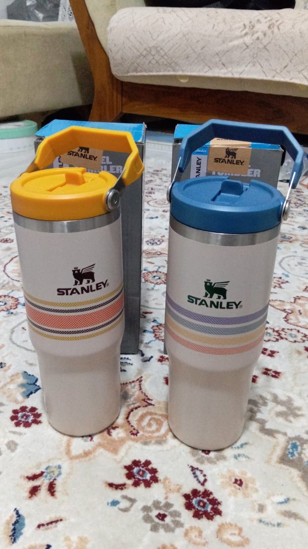 Stanley çocuk termos şişeleri, renkli sapları ve yalıtımlı paslanmaz çelik gövdesiyle içecekleri sıcak veya soğuk tutar. Dayanıklı ve taşınabilir tasarım.