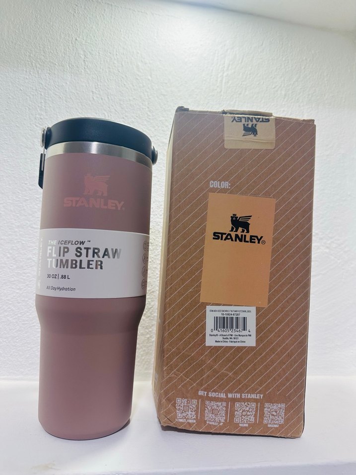 Stanley Flip Straw Termos Kupa, kolay içim için flip pipet kapağına sahip. 887ml kapasite ve koyu kapaklı bej gövde ile dayanıklı tasarım.