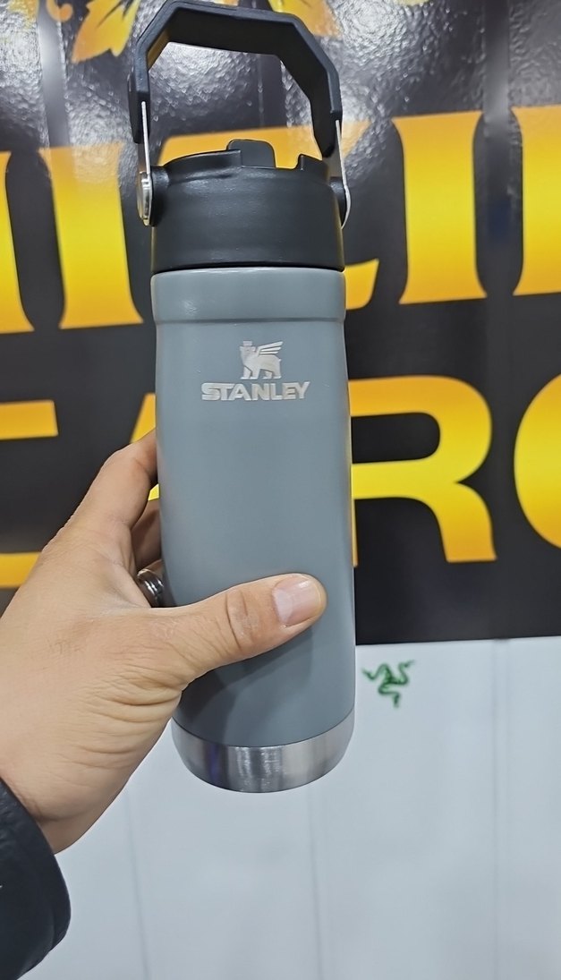 Stanley gri çocuk termos matara, sağlam tasarımı, güvenli kapağı ve taşıma askısı ile içeceklerinizi uzun süre sıcak veya soğuk tutar.