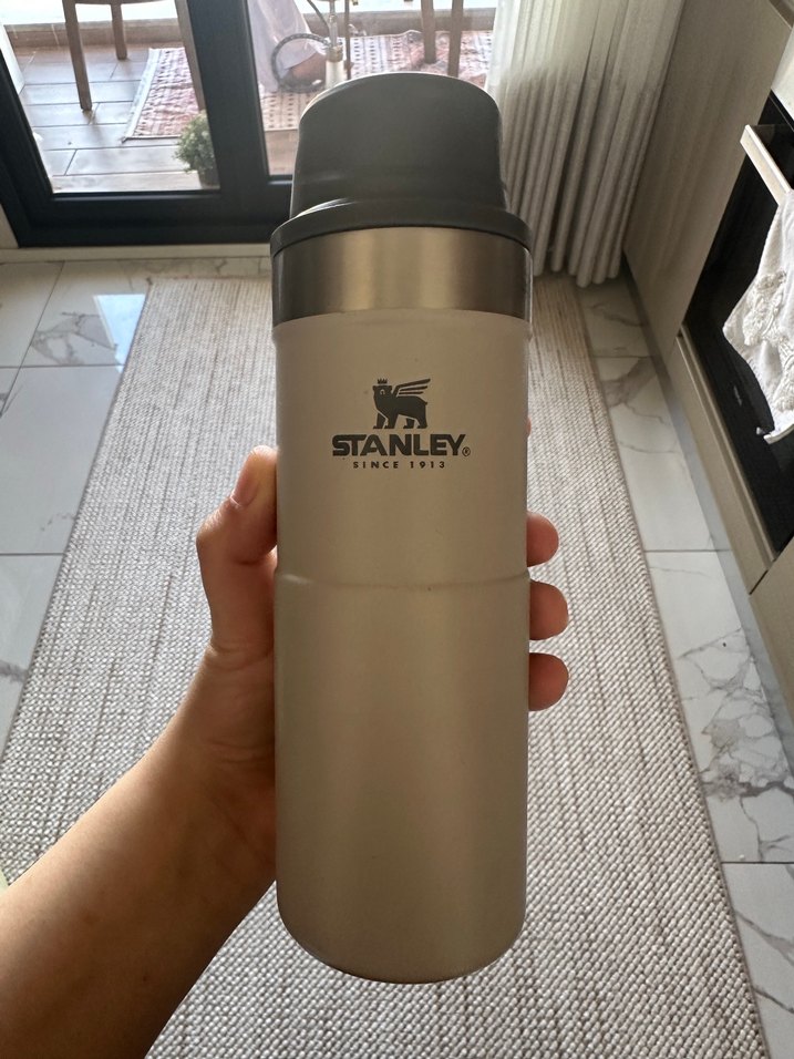 Stanley gri renkli termos matara, dayanıklı yapısı ve güvenli kapağı ile içeceklerinizi uzun süre sıcak veya soğuk tutar.