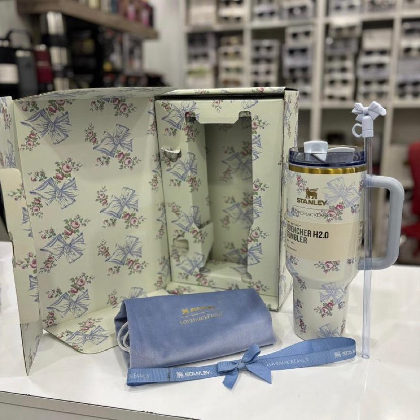 Stanley H2O termos bardak, pastel beyaz renk ve çiçek desenine sahip. Sıcak veya soğuk içecekleri uzun süre muhafaza eder.