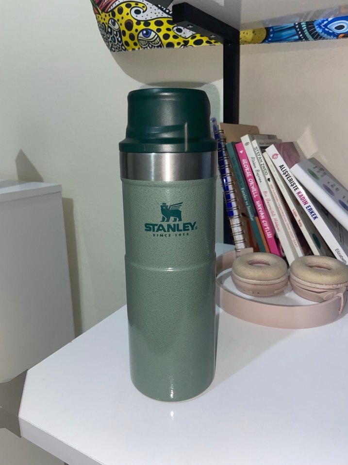 Stanley markalı khaki termos, içecekleri sıcak veya soğuk tutan dayanıklı yalıtım sağlar. Kaymaz yüzey ve güvenli kapak ile çocuklar için uygundur. Derin ve büyük olmamakla mikro cizikler olabilir